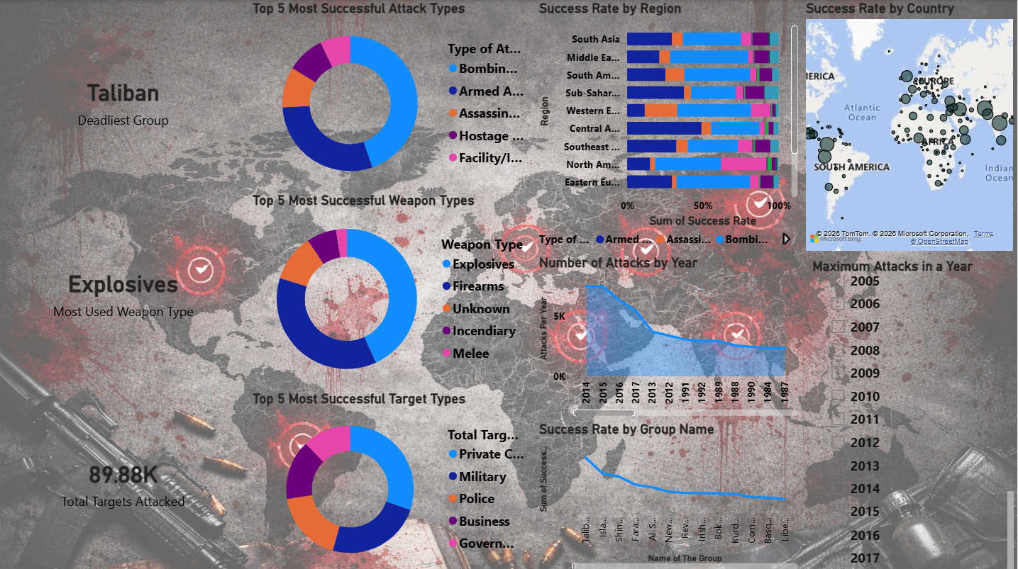 This Power BI dashboard highlights key patterns in global terrorism, showing where attacks occur most and which methods and groups are most effective, providing clear insights into evolving trends.