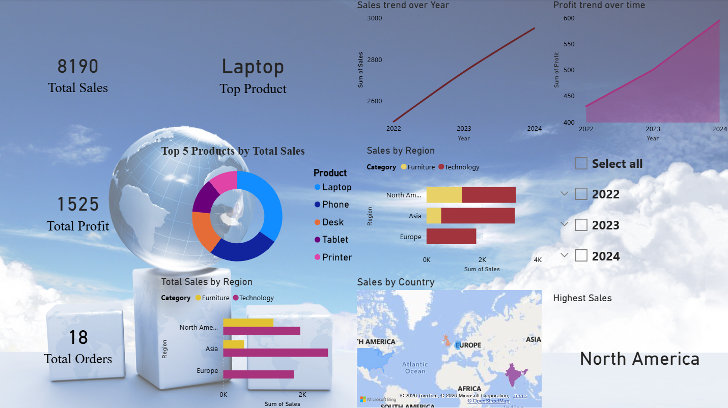 This interactive Power BI sales dashboard highlights key business metrics, including total sales, profit, and orders. It visualizes sales trends over time, top-performing products, and regional performance, enabling quick insights and data-driven decision-making.